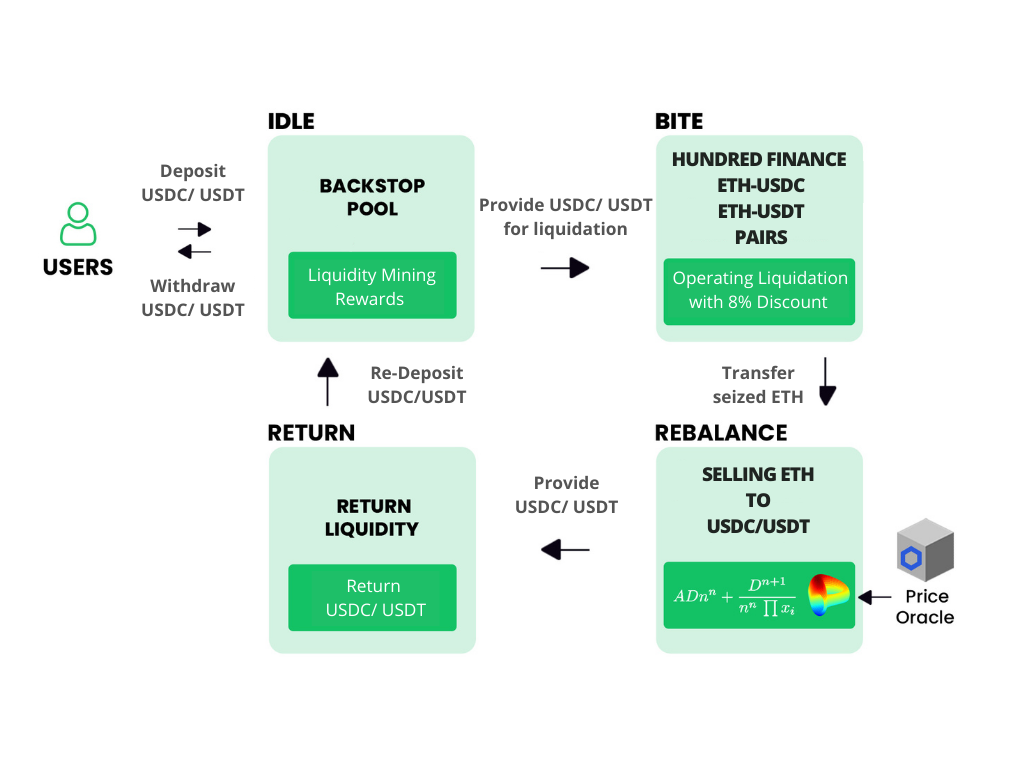 - Hundred Finance “backstoppers” who provide liquidity to our backstop pool, as they receive a passive yield by getting a share of liquidation proceeds and help to decentralize the liquidity provision for liquidations.