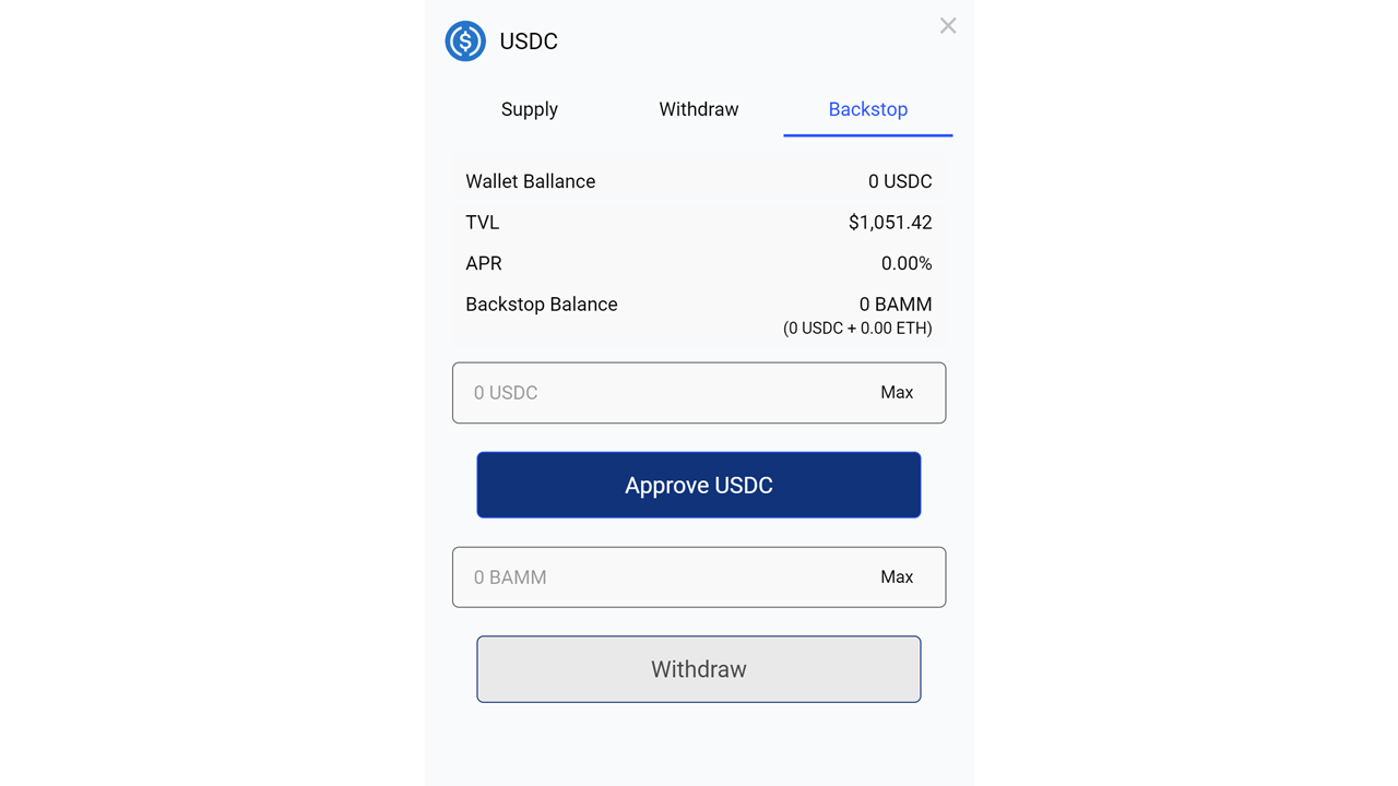 Selecting one of these two assets will then open the deposit interface featuring a Backstop tab. This tab can be used to approve the relevant token, make deposits and withdrawals, as well as observe total value locked and the APR for added liquidity. This APR is provided through HND token rewards, which are to be set at 5k HND per week split across the USDC and DAI pools, meaning 2500 HND per pool. This emission rate, owing to it being designed to achieve an adequate TVL to efficiently carry out liquidations, will be subject to adjustment.