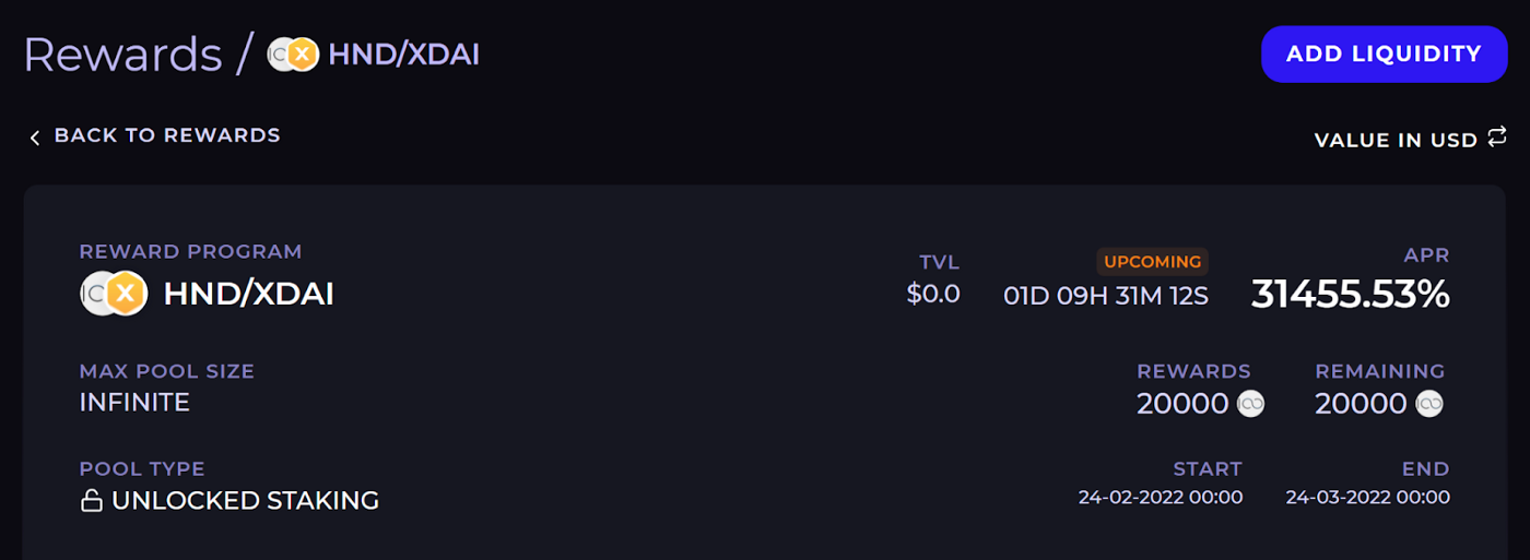 In addition to the stablecoin incentives being offered, we are also offering rewards to liquidity providers who join the HND-xDAI pool on Swapr. 20,000 HND will be made available to liquidity miners over the course of the first month. Like our stablecoin pools, these will reward participants based on their proportion of the pool’s added liquidity staked in the Swapr reward contract.