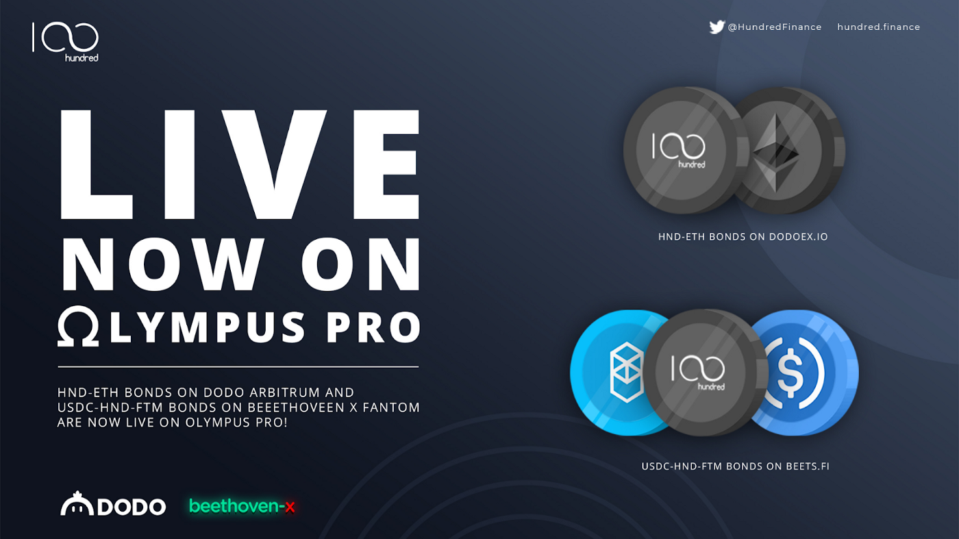 Hundred Finance is excited to announce the launch of the first stage of its multi-chain bond program, with this first iteration carried out in partnership with Olympus Pro, the industry-leading platform in building protocol-held liquidity, and covering our deployment Fantom with Arbitrum soon to follow!