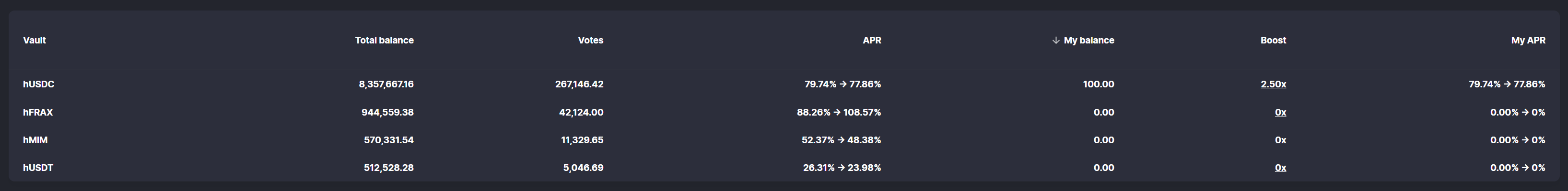 Voting power applies to all gauges but may produce different boosts based on how much liquidity is provided and how much total liquidity the pool contains. In order to provide clarity for users, on adding hTOKENS to a farming contract the staking UI will display their current boost, while mouse hovering over this figure will display the number of additional veHND that needs to be acquired in order to attain the maximum boost.
